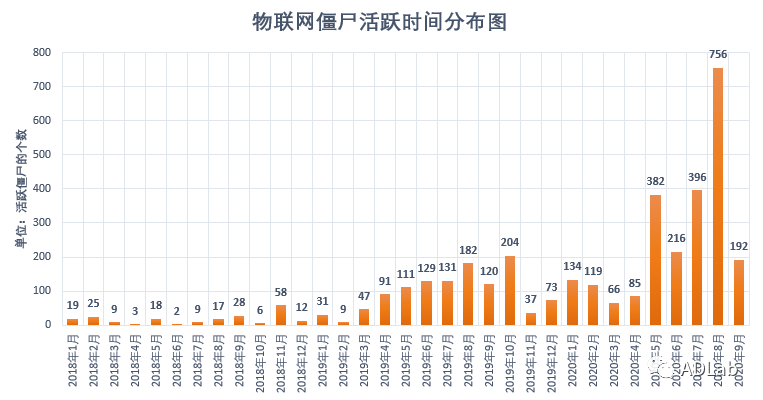 ÎÒÃǶÔÕâЩÑù±¾µÄ»îÔ¾ÊýÄ¿ºÍ»îԾʱ¼ä¾ÙÐйØÁªÍ³¼Æ£¬»æÖÆÁËÎïÁªÍø½©Ê¬»îԾʱ¼äÂþÑÜͼ£¬¼ûͼ6¡£´ÓÕâÅúÑù±¾µÄ¹¥»÷ʱ¼äÀ´¿´£¬ÖÁÉÙ´Ó2018Äê1ÔÂ×îÏÈ£¬¹¥»÷Õß¾Í×îÏÈʹÓÃGafgyt¡¢Mirai×齨ÎïÁªÍø½©Ê¬ÍøÂ磬ȻºóʹÓÃ×齨ºÃµÄ½©Ê¬ÍøÂç¾ÙÐÐDDoS¹¥»÷IJÀû¡£2019Äê3Ô¹¥»÷×îÏÈ»îÔ¾£¬2019Äê10Ô·ºÆðÁËÒ»¸öСá¯Á룬¹¥»÷µÄ×îá¯ÁëÔò·ºÆðÔÚ2020Äê8Ô¡£