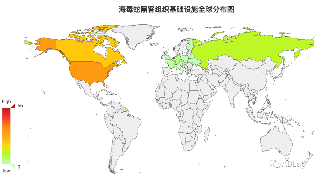 ¡°º£¶¾Éß¡±ºÚ¿Í×éÖ¯³ÖÓдó×Ú¶ñÒâÓòÃûºÍÓÃÓÚÍйܶñÒâÎļþµÄÐéÄâÖ÷»úµÈÍøÂç»ù´¡ÉèÊ©£¬ÎÒÃǶÔÕÆÎյĸúڿÍ×éÖ¯³ÖÓеÄ142¸ö»ù´¡ÉèÊ©×ÊÔ´¾ÙÐÐÁ˵ØÀíλÖÃÂþÑÜͳ¼Æ£¬·¢Ã÷ËüÃÇÖ÷ÒªÂþÑÜÔÚ21¸ö¹ú¼ÒºÍµØÇø£¬ÆäÖÐÂþÑܽÏΪ÷缯µÄ¹ú¼ÒΪºÉÀ¼¡¢ÃÀ¹ú¡¢¼ÓÄô󡢶íÂÞ˹ºÍµÂ¹ú£¬ÓÈÒÔ¡°ºÉÀ¼¡±ºÍ¡°ÃÀ¹ú¡±×îΪ÷缯£¬»®·ÖÊÇ55¸öºÍ31¸ö£¬Í¼9ÊÇÎÒÃÇ»æÖƵĺ£¶¾ÉߺڿÍ×éÖ¯»ù´¡ÉèʩȫÇòÂþÑÜͼ¡£