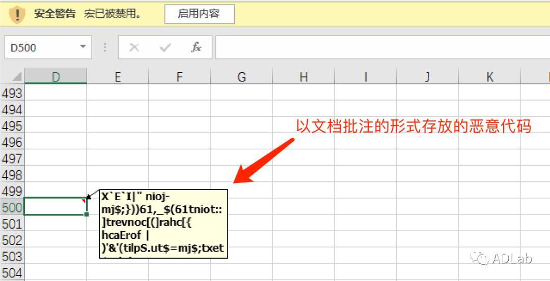 ¶ñÒâ´úÂë±»¼ÓÃÜÉúÑÄÔÚÓÕ¶üÎĵµexcel±í¸ñµÄD500µ¥Î»¸ñµÄÅú×¢ÖУ¨¼ûͼ19£©¡£ÔÚÒÔÍùµÄ´ËÀ๥»÷ÖУ¬¹¥»÷Õß´ó¶à½«¶ñÒâ´úÂë»òÊý¾Ý´æ·ÅÔÚexcelµç×Ó±í¸ñµÄµ¥Î»¸ñÄÚÈÝÖÐÒþ²ØÏÔʾ,»òÕßÒþ²Øµ½VBA¹¤³ÌÖеÄÓû§¿Ø¼þÀҲÓкڿͽ«¶ñÒâ´úÂë·ÅÈëÎĵµµÄÄÚ½¨ÊôÐÔÖС£¶øÔÚ±¾´Î¹¥»÷ÖУ¬¹¥»÷Õß½«¶ñÒâ´úÂë¼ÓÃÜ´æ·ÅÔÚÁ˵ç×Ó±í¸ñ¿Õȱµ¥Î»¸ñµÄÅú×¢ÄÚÈÝÀÕâÖÖ¶ñÒâ´úÂëÒþ²Ø·½·¨ÔÚ´ËÀ๥»÷ÖÐÕÕ¾ÉÊ״ηºÆð¡£