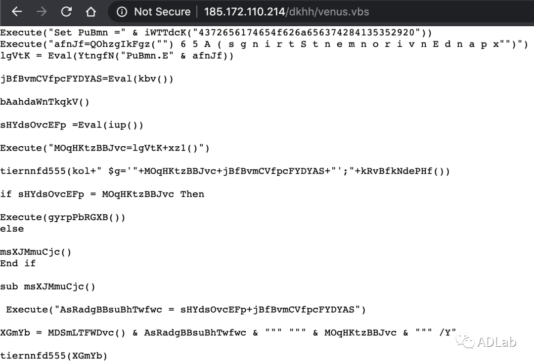 ×îºóÖ´ÐеĶñÒâ´úÂëÊÇͼ21ËùʾµÄÒ»¸öPowershell¾ç±¾£¬²»¹ý¸Ã¾ç±¾Ö´ÐеÄÏÂÁî×öÁË×Ö·û»ìÏý´¦Öóͷ£¡£¾ç±¾ÔÚÖ´ÐÐʱÏÈÊǽ«»ìÏý¹ýµÄ×Ö·û´®×ª»»³É×Ö·ûÊý×飬ȻºóŲÓÃReverseº¯ÊýÄæÐòÅÅÁиÃ×Ö·ûÊý×飬ÔÙ½«ÄæÐòºóµÄ×Ö·ûÊý×鯴½Ó³É×Ö·û´®£¬ºóÃæµÄ²Ù×÷Êǽ«×Ö·û´®ÖеÄÌî³ä×Ö·û¡®&¡¯È¥µôÔÙת»¯³É16½øÖƱàÂë¡£¾ÓÉÕâÑùµÄ¼¸²½´¦Öóͷ££¬Ö´ÐÐÏÂÁî¾Í±»»¹Ô³öÀ´ÁË£¨¼ûͼ22£©£¬´Óͼ22ÖÐÎÒÃÇ¿ÉÒÔ¿´µ½¸ÃPowershell¾ç±¾ÏÖʵÉÏÊÇÒ»¸öÏÂÔØÆ÷£¬Ëü»á´ÓÔ¶³Ì·þÎñÆ÷http://185.172.110.214/dkhh/venus.vbsÉÏÏÂÔØÒ»¸öVBSÎļþÀ´Ö´ÐС£